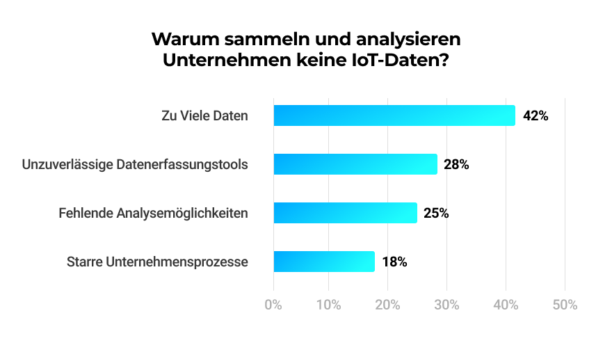 Es gibt verschiedene Gründe, warum Unternehmen keine Daten von IoT-Geräten erfassen und verarbeiten. Dazu gehören übermäßige Mengen dieser Daten, veraltete oder unzuverlässige Datenerfassungstools und fehlerhafte Datenanalyseverfahren.