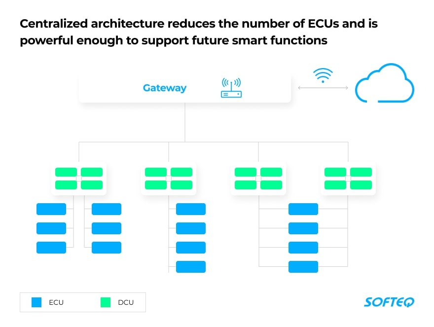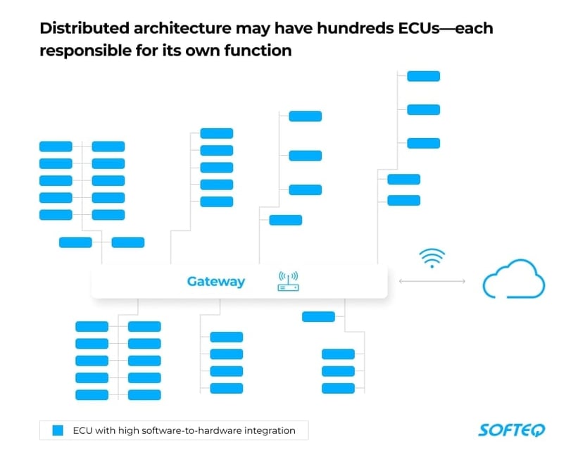An established vehicle features a distributed electrical/electronic (E/E) architecture that may have more than 100 electronic control units (ECUs)—each responsible for its own function. An ECU has an embedded microcontroller which controls actuators, processes sensor signals, and controls mechanical operations. ECUs are connected with each other by wires and support limited interactions. As manufacturers expand functionality for new car generations, the ECU network becomes even more complicated. And the high software-to-hardware integration within each ECU results in the dependency of car manufacturers on their suppliers.