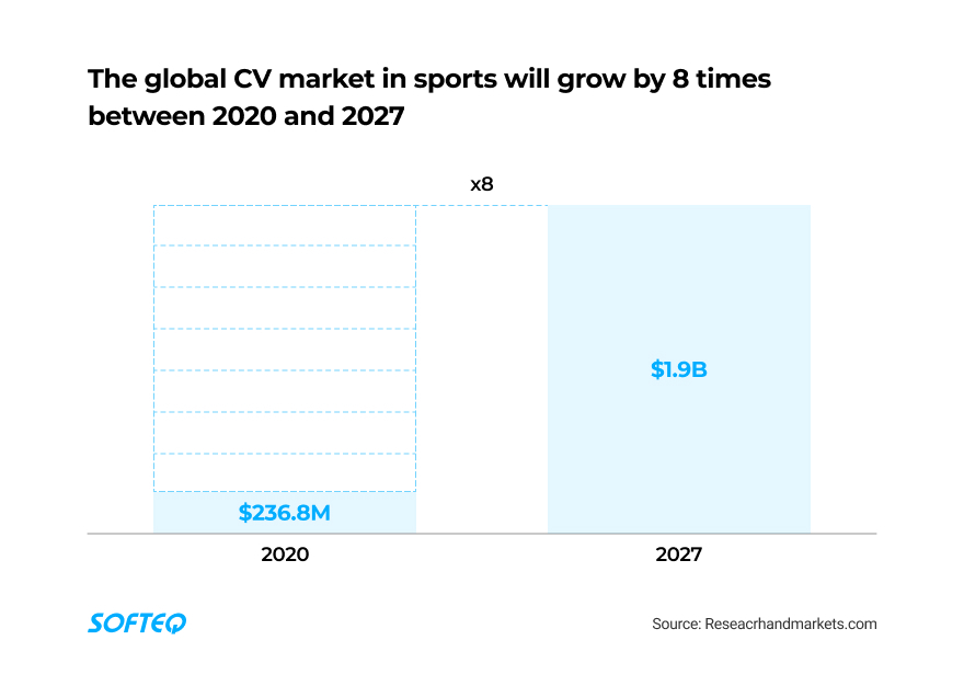 The sports industry is all about precision and accuracy, and computer vision can help clubs tackle these challenges. The technology is highly ambitious: the market is growing rapidly and is projected to increase eightfold by 2027.