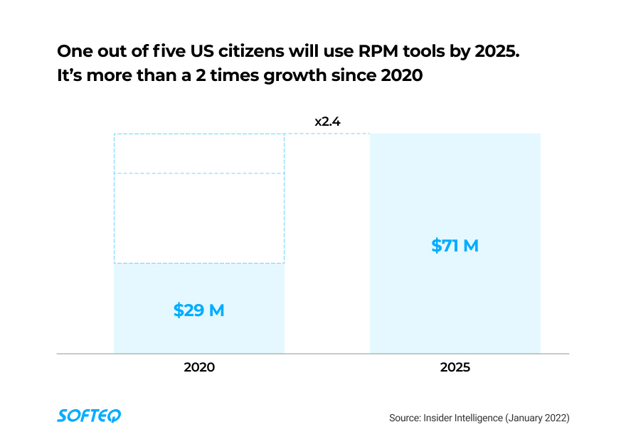 COVID-19 has given a boost to RPM solutions and their popularity continues to rise. Prior to the pandemic, healthcare IoT mainly targeted seniors to help them stay safe and to alert caregivers in emergency cases. In 2022, a variety of patients monitor their vital signs at home. Today, one-third of consumers will choose providers that allow them to share data from connected health devices.