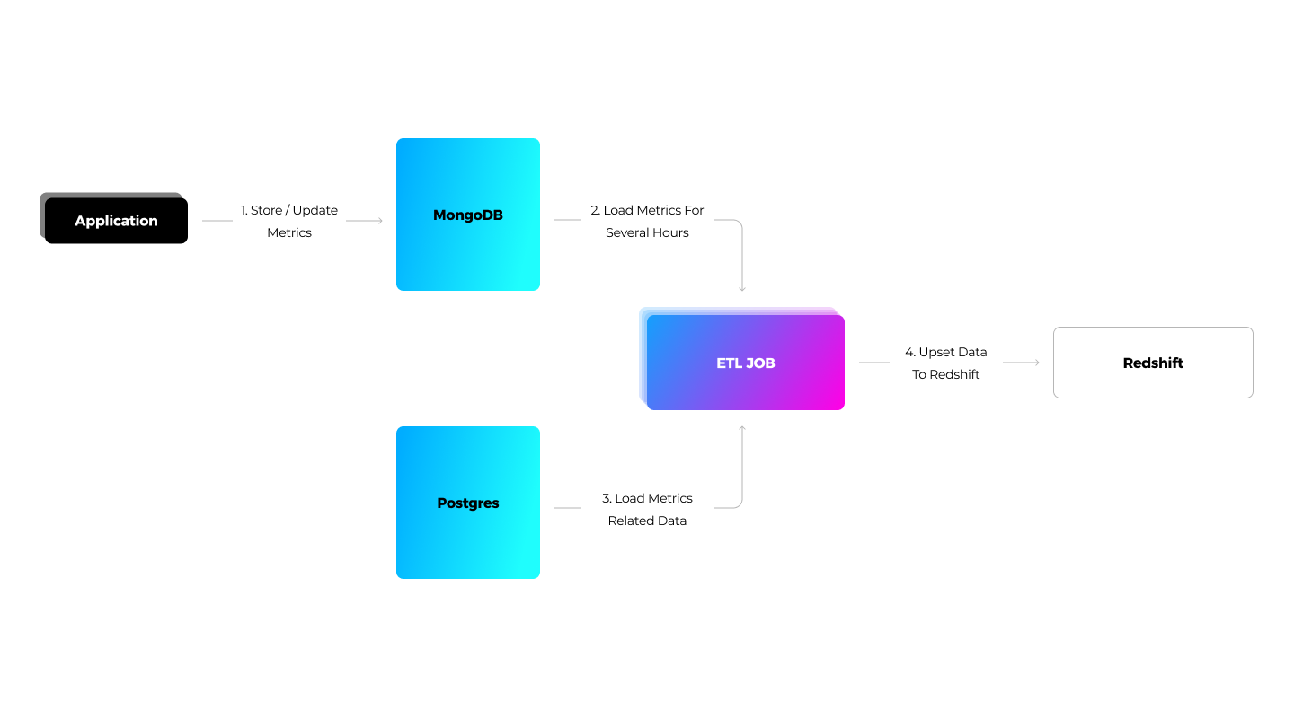 The media streaming solution uses MongoDB to process ad performance metrics. ETL jobs are responsible for the batch loading of the metrics from MongoDB/Postgres to Redshift. Thanks to the modified_date_time column, we know when the data has been modified. To implement the ETL jobs, we used Spring Boot with the Redshift JDBC Driver. For report generation, the application constructs and directly sends queries to Redshift with the Redshift JDBC driver.