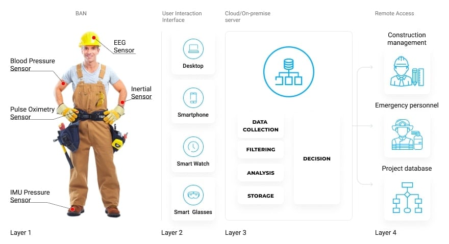 Wearable solutions for construction site safety exchange data at three levels: