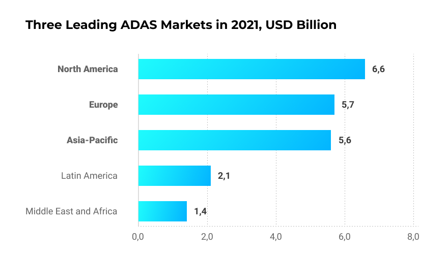 Asia-Pacific is the third leading global ADAS market. It is expected to grow the fastest thanks to increased vehicle production in India and China and the growing number of luxury vehicles across the region. Stringent government regulations in Asia-Pacific countries will also lead to higher adoption of ADAS systems. As of today, some ADAS solutions are already mandatory for all new vehicles produced in the region. They include: blind spot detection, adaptive cruise control, and lane departure warning systems.