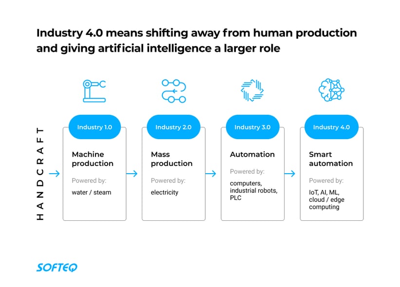 The innovation in Industry 4.0 is using IoT data for production. In other words, machines are equipped with sensors that generate data and send it to the cloud. There, artificial intelligence interprets the data, recognizes and predicts anomalies, and notifies people at the right moment. The most advanced solutions can even optimize manufacturing processes without human involvement.