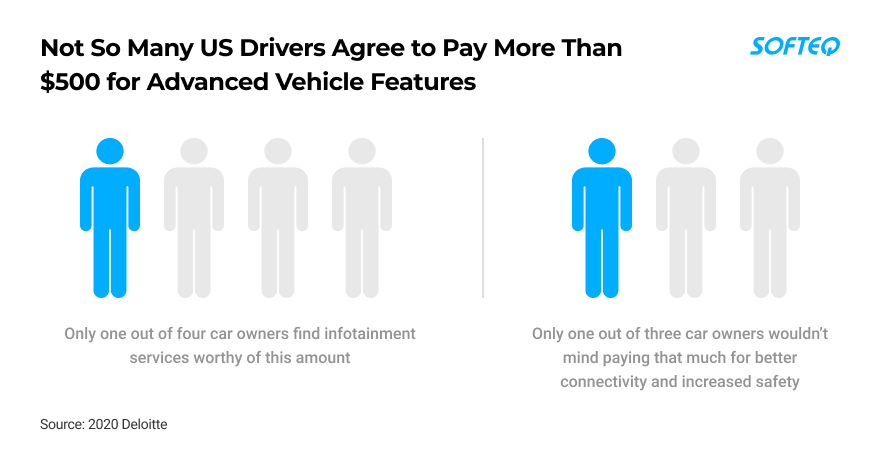 Customer demand for customized vehicles and ultra-personalized services is growing. More than 50% of drivers are currently willing to pay up to $500 more for additional functionality. That includes infotainment, better in-car HMI design, and increased security.