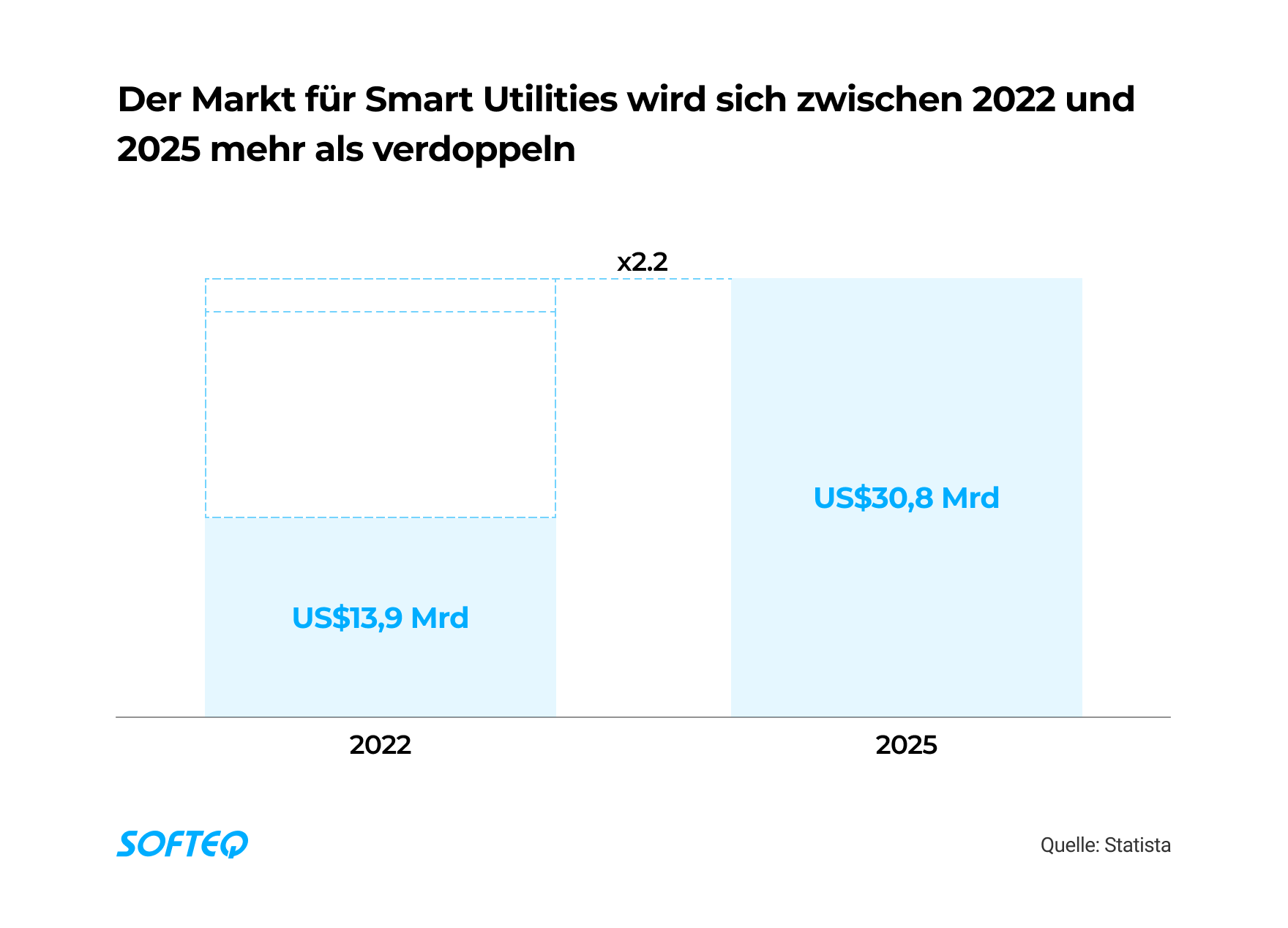 Der Markt für Smart Utilities wächst rasant. Laut Statista wird sich die Marktgröße von 13,9 Milliarden US-Dollar im Jahr 2022 auf 30,8 Milliarden US-Dollar im Jahr 2025 verdoppeln.