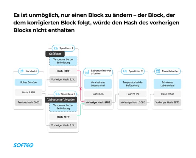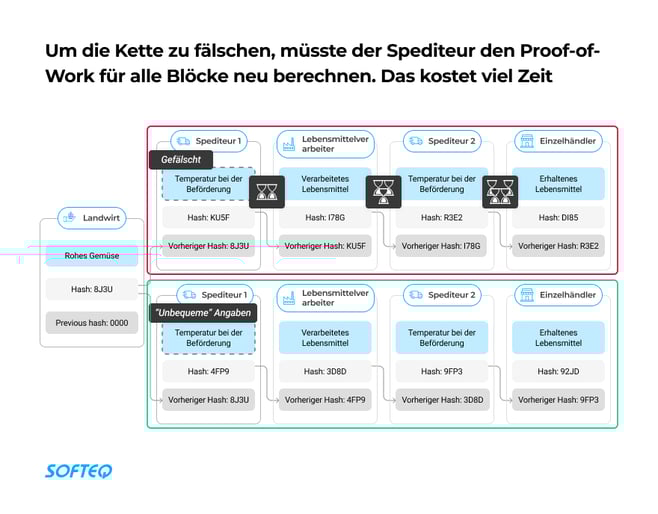 Und selbst wenn der Spediteur die Aufzeichnungen im System ändern wollte, wäre dies dank der Schutzmechanismen der Blockchain gegen Manipulationen unmöglich. Schauen wir uns die Schutzmechanismen genauer an: