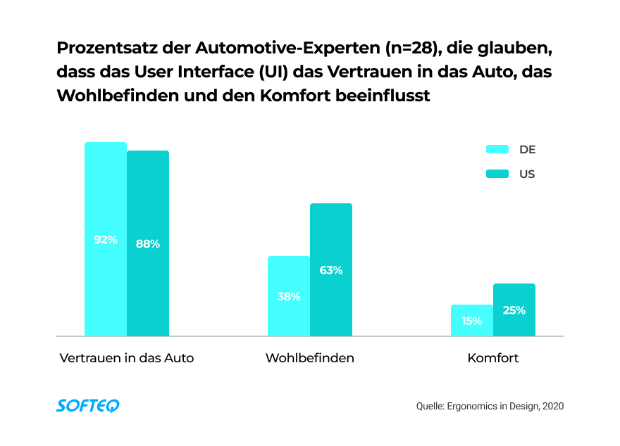 Um die Akzeptanz für autonomes Fahren weiterhin zu erhöhen, müssen außerdem kulturelle Unterschiede berücksichtigt werden. Das zeigt u. a. diese Studie über kulturspezifische Design-Anforderungen von autonomen Level 4 Fahrzeugen in China, Deutschland und die Vereinigten Staaten. In Deutschland wird das Vertrauen der Fahrer in ihr Fahrzeug stark durch das User Interface beeinflusst. In den USA hat das User Interface vor allem Einfluss auf das Wohlbefinden und den Komfort der Nutzer. OEMs müssen diese Unterschiede in ihrem Usability Design berücksichtigen.