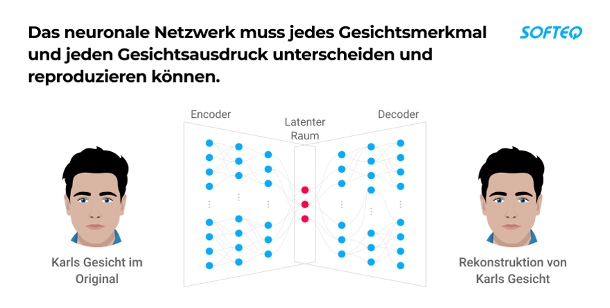 In der Trainingsphase lernt das neuronale Netzwerk, das Gesicht von Karl in das von Klara und andersherum zu konvertieren. Für diesen Schritt ist üblicherweise eine spezielle Deep Network-Architektur zuständig, bekannt als Autoencoder. Dieser besteht aus drei Teilen: