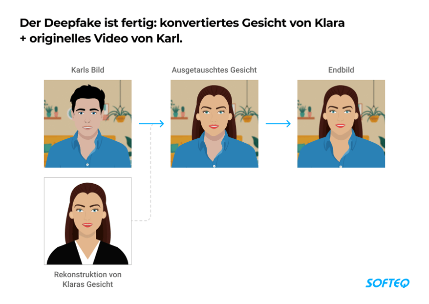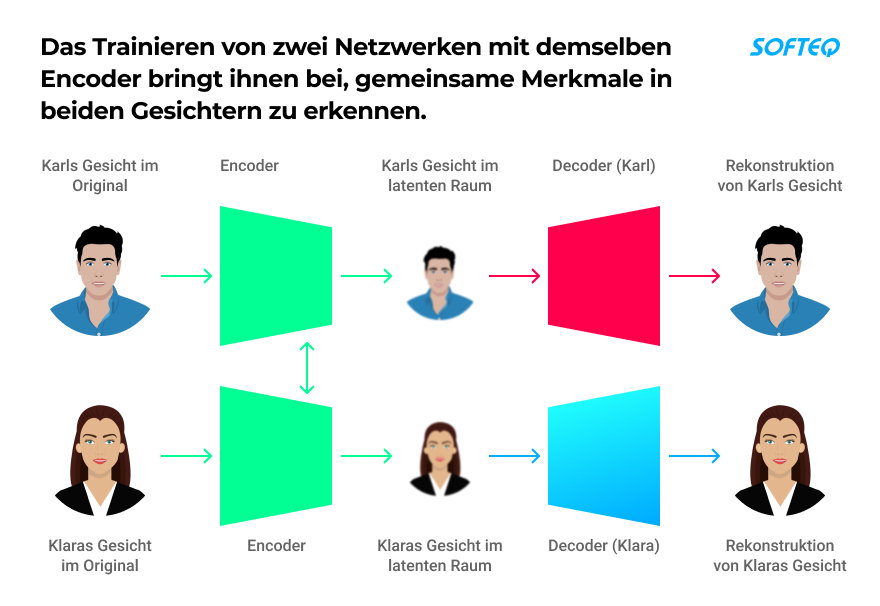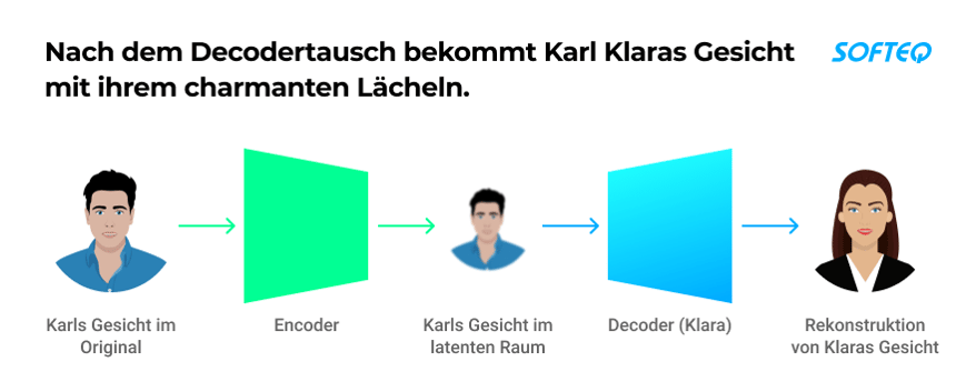Wenn die Netzwerke ausreichend trainiert sind, werden die Decoder ausgetauscht. Karls Gesichtsausdrücke werden dann mit Klaras Decoder anstelle seines eigenen generiert. Dabei wird seine Mimik beibehalten, aber mit Klaras Gesicht rekonstruiert, und umgekehrt.
