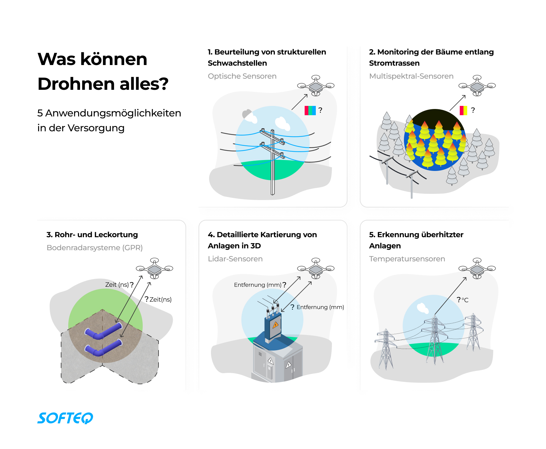 Wie Drohnen für die Inspektion und Kartierung wichtiger Versorgungsinfrastrukturen eingesetzt werden können, zeigen die nun folgenden Anwendungsfälle. Diese Use Cases haben wir mit Beispielen aus der Praxis untermauert.