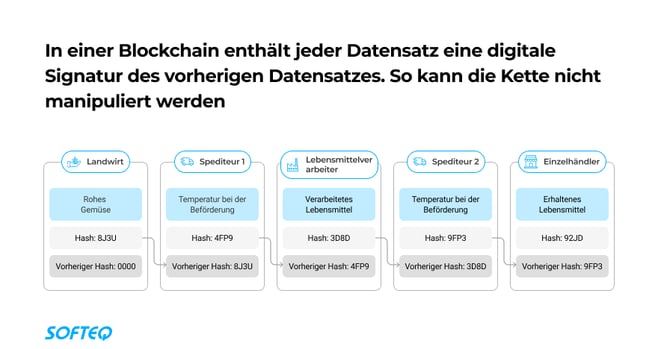 Blockchain in Verbindung mit IoT kann in all diesen Situationen nützlich sein. IoT-Sensoren verfolgen Standort, Temperatur und andere Parameter während des Transports. Blockchain zeichnet die Sensordaten auf, während sich das Produkt durch das gesamte Logistiknetzwerk bewegt. Dadurch erhalten die Unternehmen die volle Kontrolle über die Temperaturbedingungen während des Transports. Das bedeutet, dass sie Schwachstellen in der Kühlkette schnell finden und beheben können.
