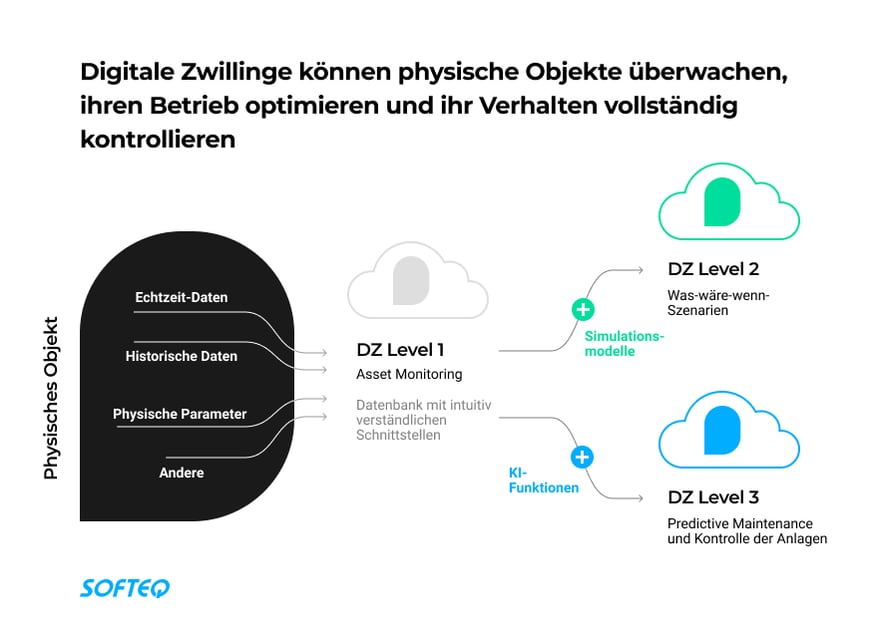 Basislevel: Asset Monitoring. Um einen DZ zu erstellen, sammeln Datentechniker relevante Daten über das reale Objekt (Echtzeit- und historische Sensordaten, Wartungsdaten usw.). Anschließend speisen sie diese Informationen in eine DZ-Software ein, die ein virtuelles Modell des Objekts in der Cloud erstellt. Solche Modelle ermöglichen es, physische Assets zu überwachen und Daten für eine zukünftige Nutzung über sie zu sammeln. Auf dieser Ebene ist ein DZ nichts anderes als eine Datenbank mit intuitiv verständlichen Schnittstellen, in Hinblick Funktionalität und Kosten.