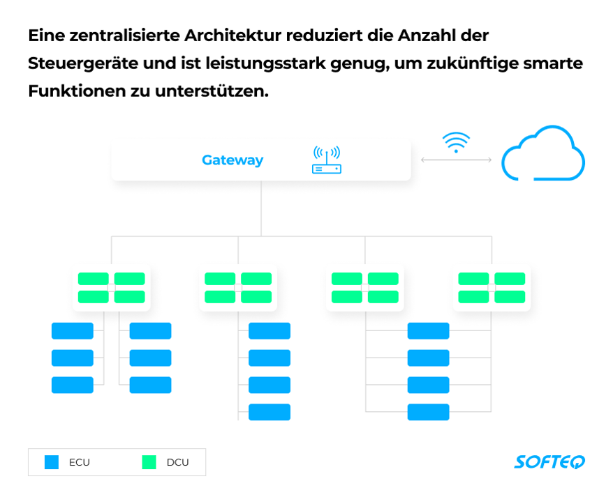 Die zentralisierte Architektur, ein neuer Ansatz für elektronische Architektur, hilft die Komplexität zu bewältigen und das Problem der Abhängigkeit von Zulieferern zu lösen. Bei dieser Art von Architektur werden mehrere verschiedene Rechnergruppen zu einem zentralen System mit speziellen Domain Control Units (DCUs) zusammengeführt. Dieses Design ermöglicht es, die Anzahl der einzelnen Steuergeräte zu reduzieren, Funktionen zu konsolidieren und den Kabelbaum zu vereinfachen.