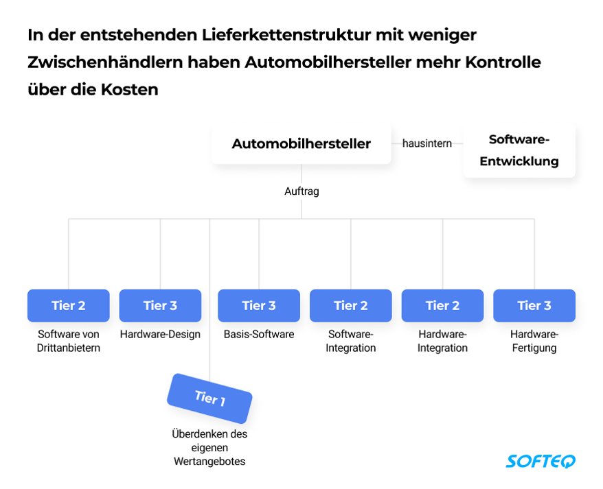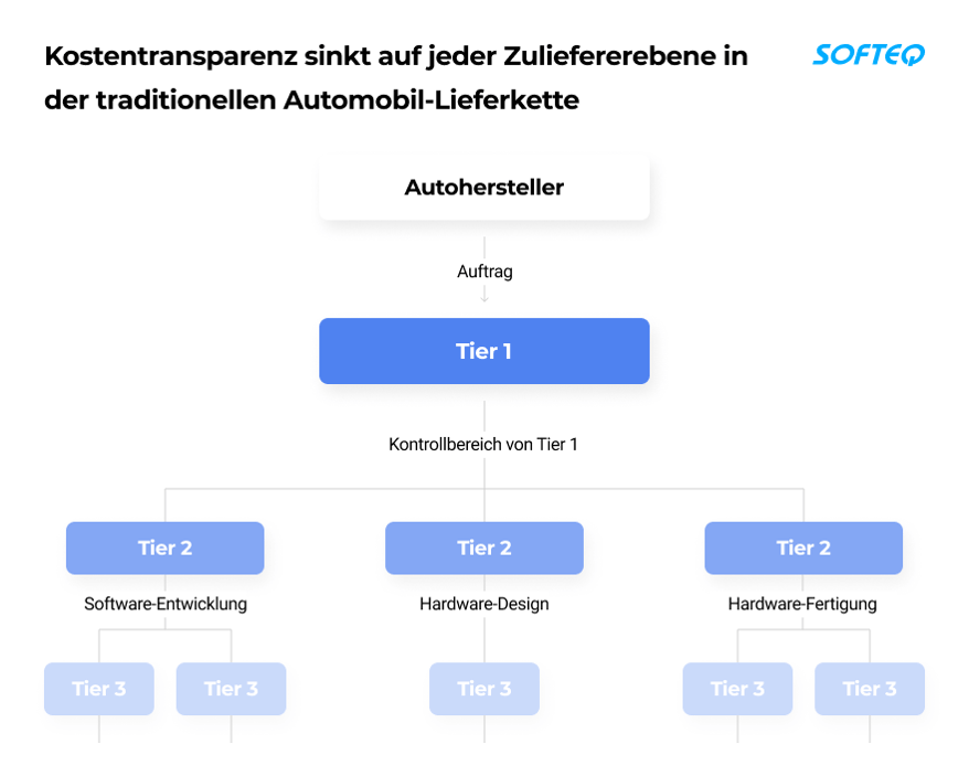 In der neuen Realität ist die Wertschöpfungskette in drei verschiedene Bereiche unterteilt: Software-Design und -Integration, Hardware-Design und -Integration sowie Hardware-Fertigung. Jetzt genießen Automobilhersteller eine höhere Transparenz. Sie können die Kostenstruktur überblicken und in direkte Verhandlungen mit Tier-2-Lieferanten treten.