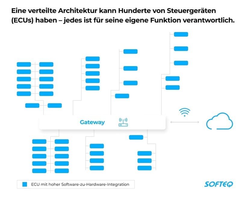 Ein normales Fahrzeug verfügt über eine verteilte elektrische/elektronische (E/E) Architektur, die sich ihrerseits aus mehr als 100 elektronischen Steuergeräten (electronic control units, ECUs) zusammensetzen kann. Jedes Steuergerät ist für eine eigene Funktion verantwortlich. Ein Steuergerät verfügt über einen eingebetteten Mikrocontroller, der Aktoren steuert, Sensorsignale verarbeitet und mechanische Vorgänge steuert. ECUs sind über Drähte miteinander verbunden und unterstützen nur bestimmte Interaktionen. Da Hersteller die Funktionalität für neue Fahrzeuggenerationen erweitern, wird das Steuergeräte-Netzwerk immer komplizierter. Und die hohe Software-zu-Hardware-Integration innerhalb jedes Steuergeräts macht Automobilhersteller abhängig von ihren Zulieferern.