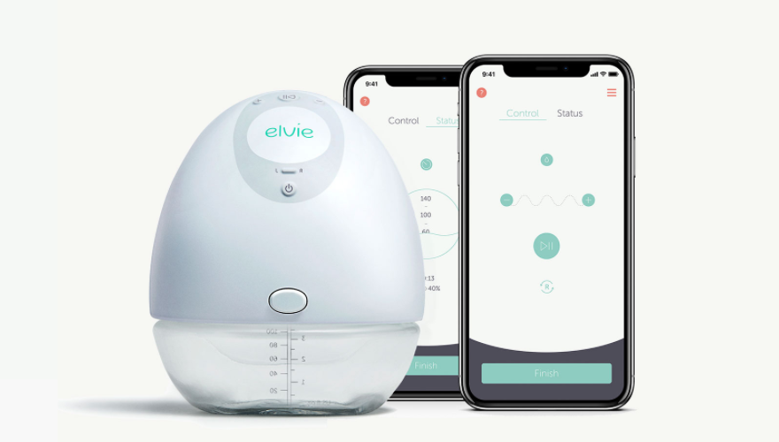 Milchpumpe von Elvie. Die Elvie Pump ist eine leise, kabellose, tragbare Milchpumpe. Man kann sie mit einer App verbinden, um die Milchmenge in Echtzeit zu überwachen, den Abpump-Verlauf für jede Brust nachzuverfolgen und die Pumpe fernzusteuern.