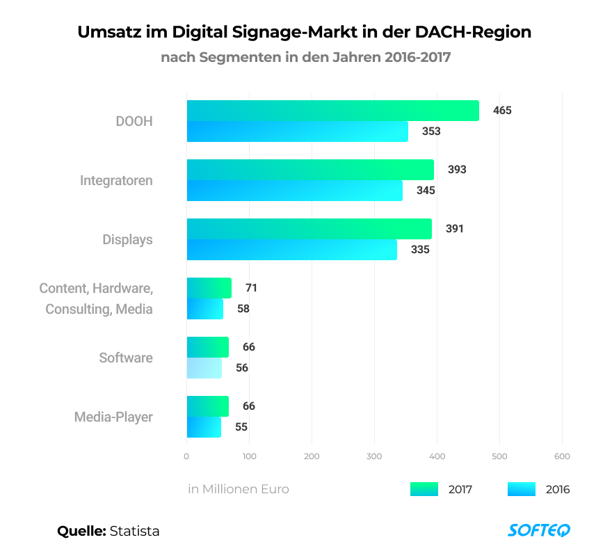 Die globale Verbreitung von Digital Signage-Lösungen nimmt zu und dies bringt mit sich immer mehr Möglichkeiten. Laut Grand View Research könnte der weltweite Digital Signage-Markt bis 2025 ein Volumen von 31,71 Milliarden US-Dollar erreichen. Das entspräche einem Wachstum von 8 %. Lösungen für den Einzelhandel und das Transportwesen weisen derzeit den höchsten Anteil am Marktvolumen auf. Erhebliches Wachstumspotenzial zeigt Digital Signage auch im Gesundheitswesen, Unternehmenssektor und Gastgewerbe.