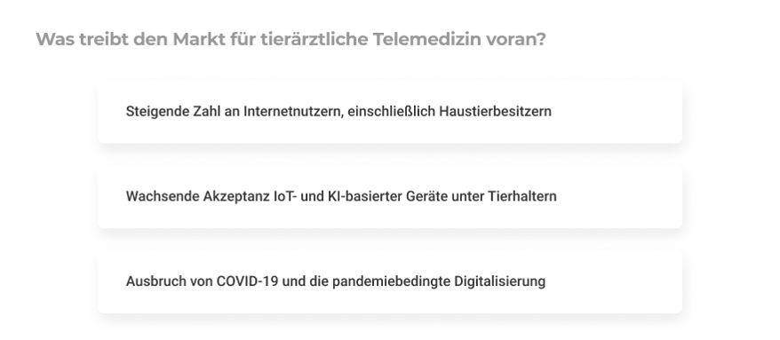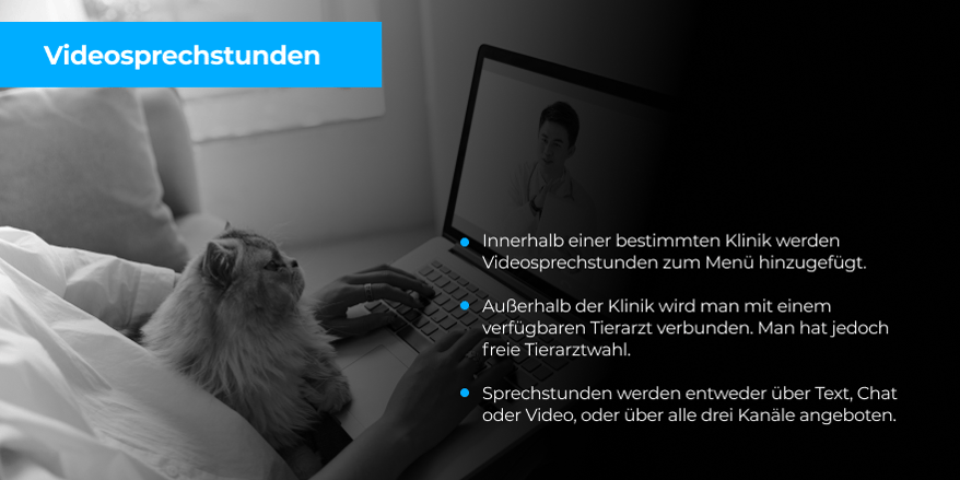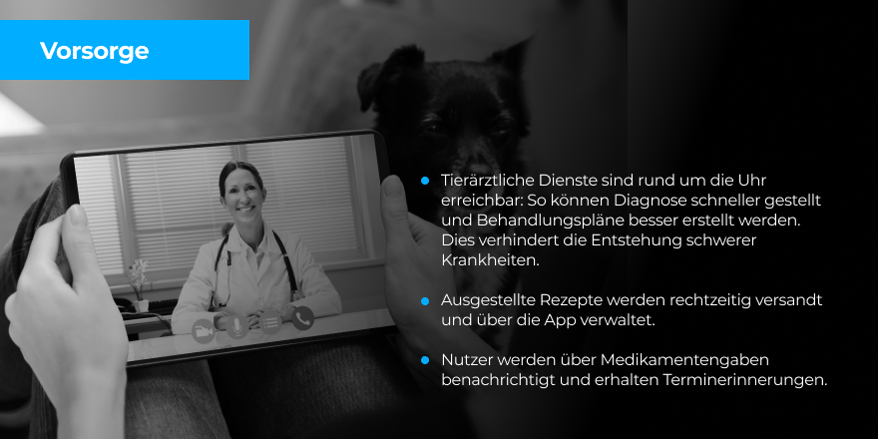 Mit modernen Telekommunikationsmitteln haben Kunden jederzeit und von überall her Zugang zu hochwertiger tierärztlicher Versorgung und sind weniger davon abhängig, ob ein Transport aufgrund des Gesundheitszustandes des Tieres möglich ist. Virtuelle tierärztliche Lösungen helfen dabei, Behandlungsunterlagen an einem Ort zu sammeln und zu speichern, sie bieten Telefon- und Videosprechstunden und erleichtern das Chatten von Ärzten mit ihren Kunden über eine Web- oder Smartphone-App.