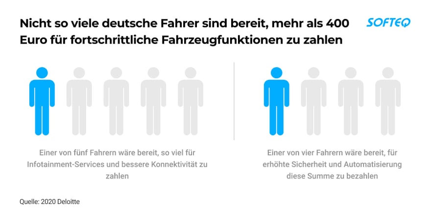 Die Kundennachfrage nach maßgeschneiderten Fahrzeugen und ultra-personalisierten Services wächst. Bislang ist ungefähr ein Drittel der deutschen Fahrer bereit, mehr als 400€ für zusätzliche Funktionen zu bezahlen, darunter erhöhte Sicherheit und Automatisierung.