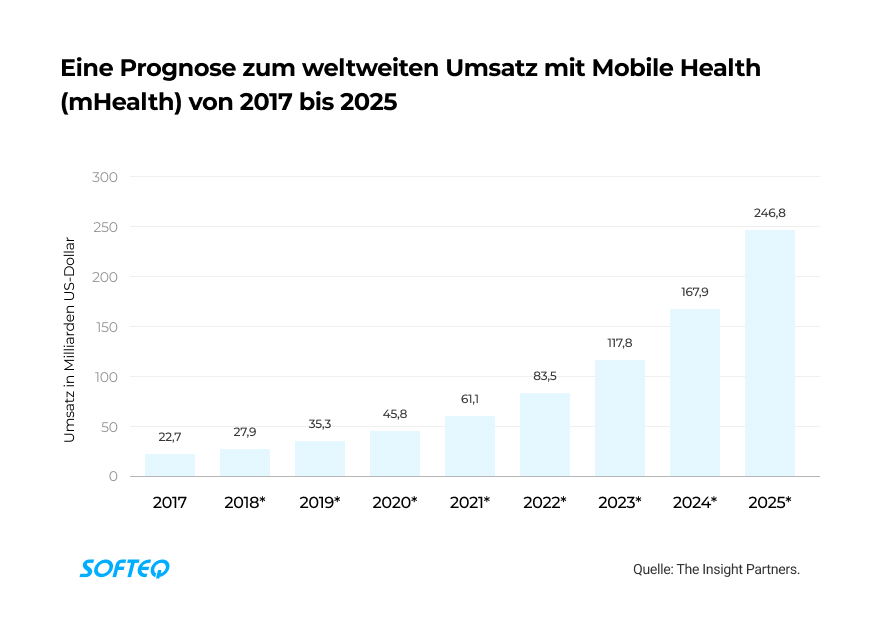 Über 350.000 Gesundheits-Apps wurden laut einer Studie des IQVIA Institutes Ende 2021 in den verschiedenen App-Stores weltweit angeboten. 2015 waren es nur die Hälfte. Ganz vorne mit dabei sind Apps für psychische Gesundheit, Diabetes und Herz-Kreislauf-Erkrankungen: zusammen machen sie fast die Hälfte der krankheitsspezifischen Apps aus. Erwartet wird, dass der Markt für Gesundheits-Apps 2025 bei rund 246,8 Milliarden US-Dollar liegen wird.