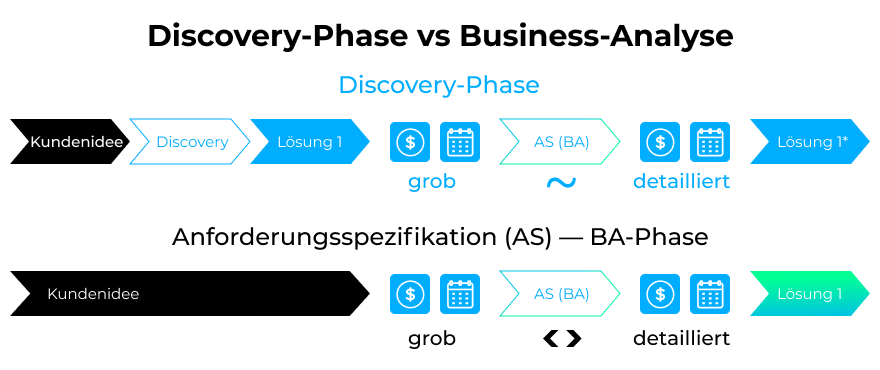 Nach der Discovery-Phase erhält der Kunde eine Markt- und Wettbewerbsanalyse, den voraussichtlichen Lösungsumfang, Mockups und einen Kostenvoranschlag.
