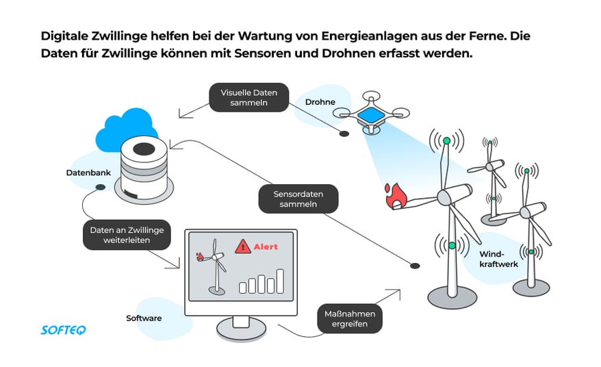 Mit Digital Twins-Technologie werden virtuelle Klone von physischen Anlagen erstellt. An den Anlagen angebrachte Sensoren können Leistungsdaten an virtuelle Nachbildungen physischer Anlagen – digitale Zwillinge – weiterleiten. Es ist möglich, Daten an ML-Algorithmen zu senden, um potenzielle Probleme oder Systemausfälle zu erkennen und die Betreiber zu warnen, damit sie sofort Maßnahmen ergreifen können.