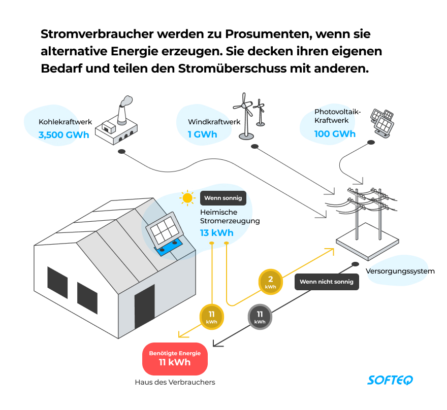 Prosumenten sind Stromverbraucher, die selbst alternative Energie erzeugen. Mit dieser Energie können sie einen Teil ihres Strombedarfs decken und den Überschuss an das lokale Stromnetz verkaufen. Im Allgemeinen können heute viele Parteien erneuerbare Energie erzeugen, verbrauchen und gemeinsam nutzen. Dazu gehören: