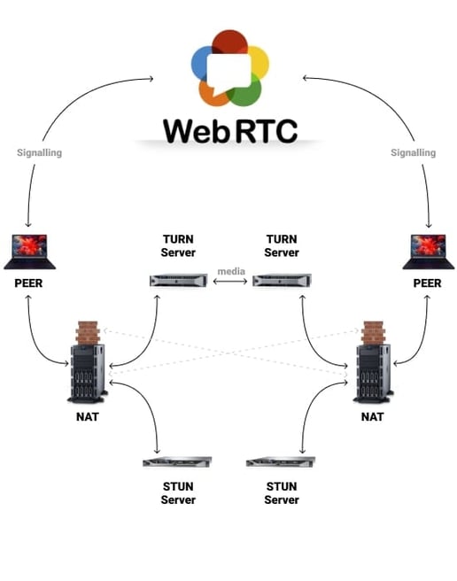 Für einen Telefon- oder Videoanruf mit einem Nutzer außerhalb des Heimnetzwerks verwendet WebRTC Session Traversal Utilities for NAT (STUN) und Traversal Using Relays around NAT (TURN) Server zusammen mit Signalisierungs-/Kommunikationsprotokollen. Zu den Kommunikationsprotokollen gehören: