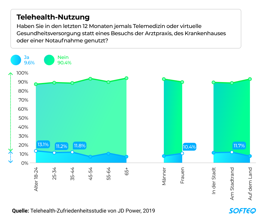 Profiteure der Telemedizin vor Corona sind aber, wenig überraschend, eher First Mover und Early Adopter: also junge, urban geprägte Digital Natives. Entsprechend fiel eine Umfrage in den USA aus: knapp 10% über alle Altersgruppen hinweg hatten eine telemedizinische Anwendung getestet. Nutzer waren eher jung, eher weiblich und lebten in der Stadt oder stadtnah, schrieb das Research-Unternehmen JD Powers. Dabei sind ländliche, ältere und digitalferne Zielgruppen diejenigen, die von Telemedizin am meisten profitieren würden.