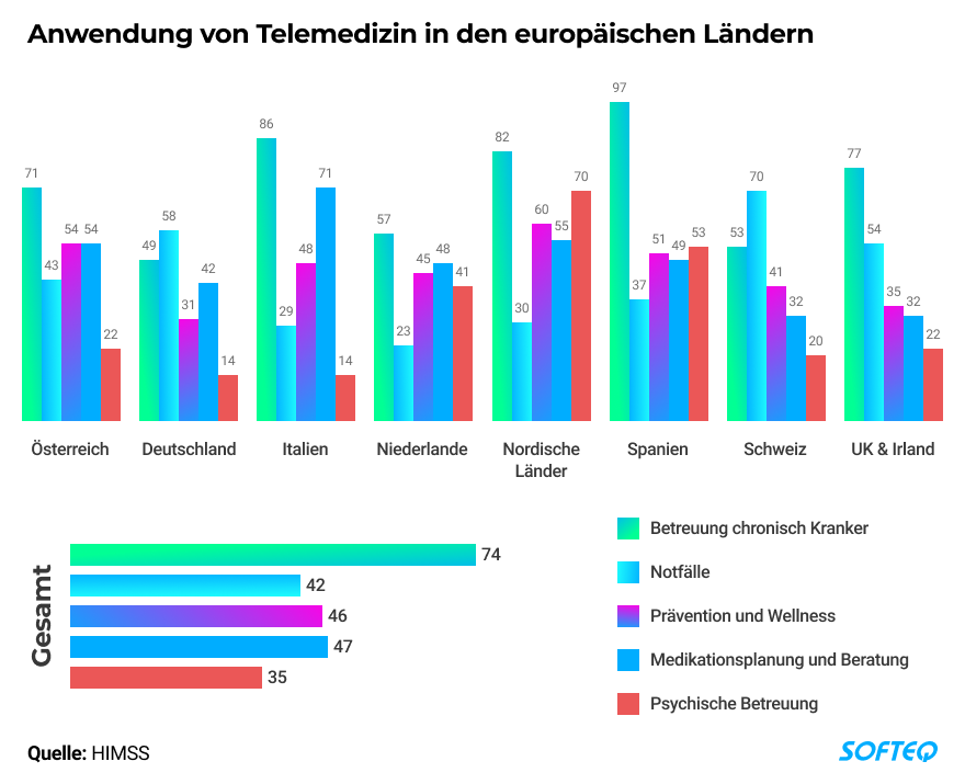 Eine interessante Studie von HIMSS (Healthcare Information and Management Systems Society, Inc. (HIMSS) verdeutlichte im Juli 2020 die unterschiedliche Schwerpunktsetzung der europäischen Länder bei der Anwendung von Telemedizin: 74% nutzten Telemedizin für die Betreuung chronisch Kranker, Spitzenreiter waren hier Spanien und Italien. Deutschland und die Schweiz nutzen Telemedizin vor allem für Notfälle. Die nordischen Länder setzen virtuelle Gesundheitsinstrumente für Prävention, Beratung und psychische Betreuung ein. Interessant sind auch die Unterschiede hinsichtlich der Frage, inwiefern Telemedizin bei der Medikationsplanung hilft: in Italien sahen dies 71% der Befragten als bedeutendes Anwendungsfeld der Telemedizin an, in der Schweiz und Großbritannien nur 32%.