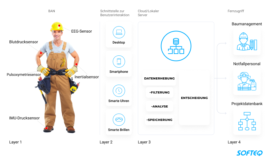 Tragbare Lösungen für Sicherheit auf Baustellen tauschen Daten auf drei Ebenen aus: