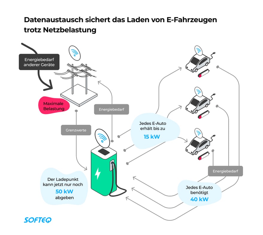 Hier kommen Smart-Charging-Technologien ins Spiel. Sie gleichen das Ungleichgewicht zwischen erzeugter Energie und Energiebedarf aus. Dafür verbindet man E-Fahrzeuge, Ladegeräte und lokale Stromnetze in einem Netzwerk, in dem alle Objekte miteinander kommunizieren und Daten austauschen.