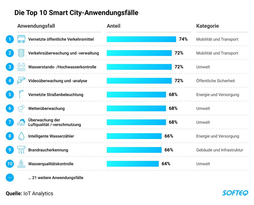 Eine von IoT Analytics veröffentlichte Umfrage zeigte: Über 70 Prozent der Großstädte verwendeten bereits 2020 IoT-Systeme zur Verkehrs-, Sicherheits- und Wasserstandsüberwachung. Umwelttechnologien, insbesondere im Bereich Energiemanagement und Versorgung machen Smart Cities lebenswerter. Dazu gehört auch Smartes Abfallmanagement.