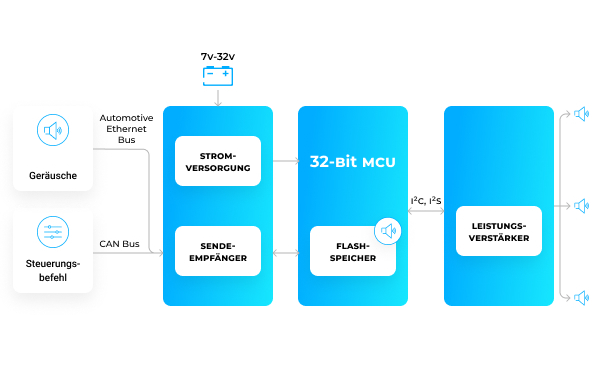 Je nach Geschwindigkeit, Fahrtrichtung, Beschleunigung, Bremslast usw. wird der passende Sound von der Multimediaeinheit über Automotive Ethernet übertragen oder aus dem internen Speicher geladen.