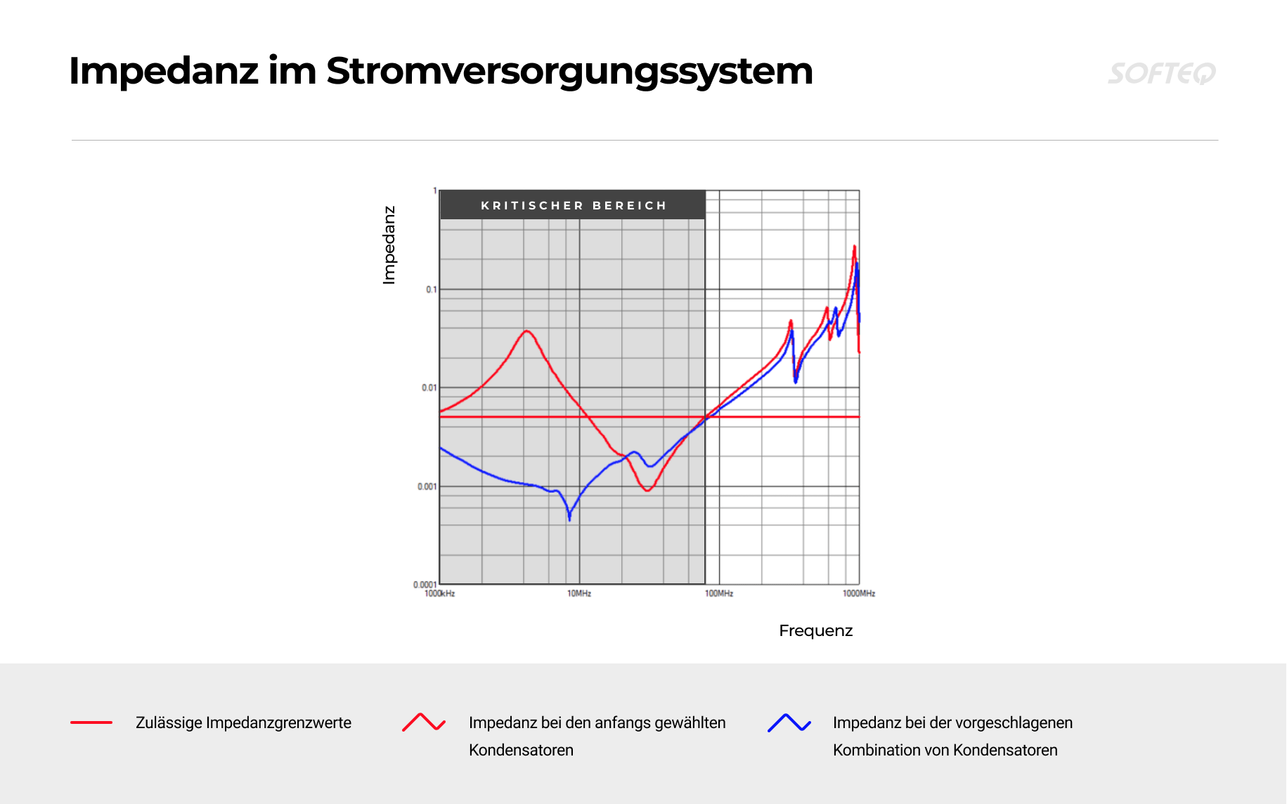 Um zu überprüfen, ob die Kondensatoren im ursprünglichen Entwurf richtig gewählt wurden (Abmessung, Kapazität, Anzahl), simulierten wir eine AC-Entkopplung. Die Ergebnisse zeigten: Mit den anfangs gewählten Kondensatoren überschritt das Stromversorgungssystem die zulässigen Impedanzgrenzwerte. Wir schlugen eine andere Kombination von Kondensatoren mit höheren Kapazitätswerten vor, wodurch sich die Impedanz deutlich verbesserte.
