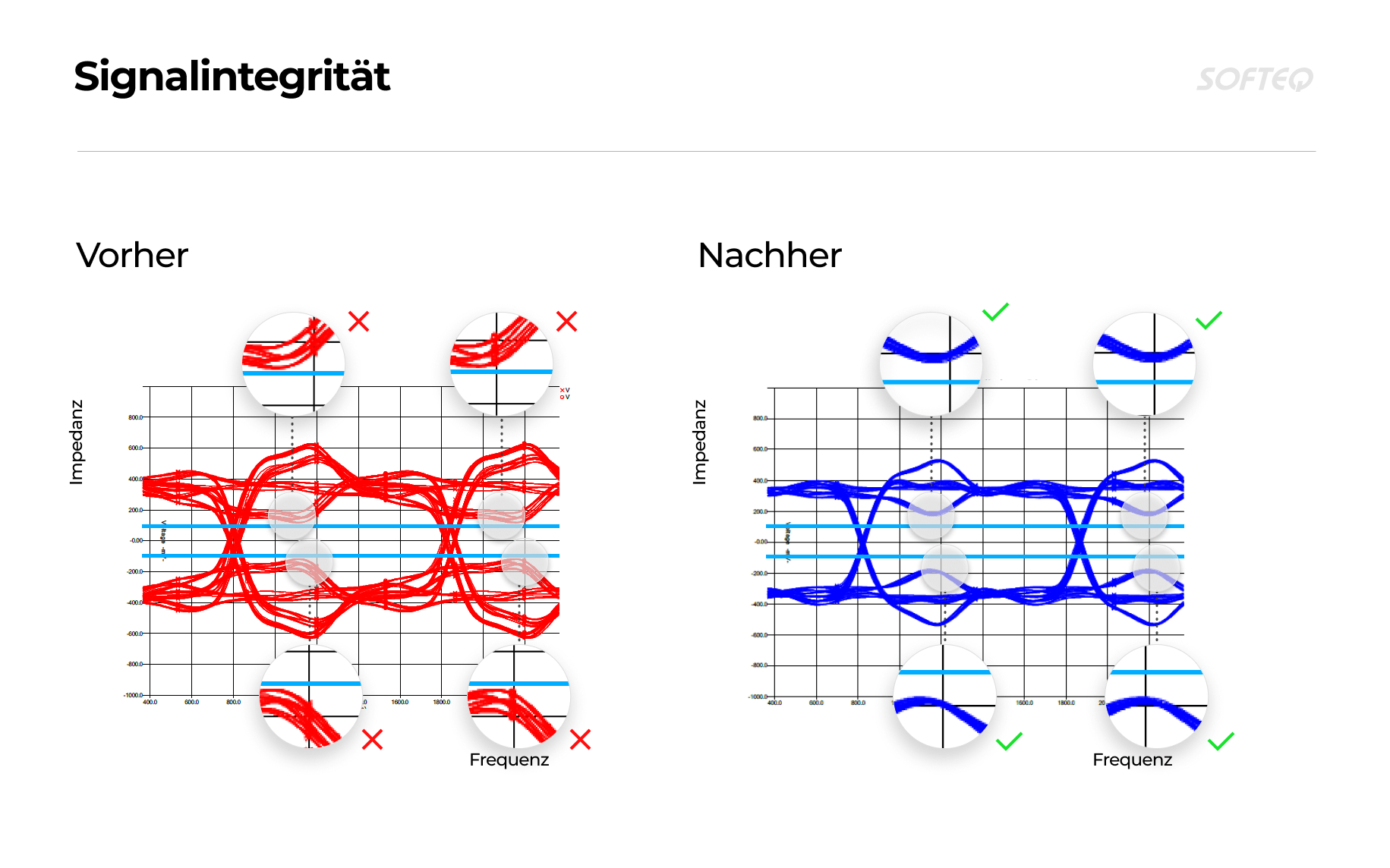 Die Simulation zeigte, dass der ursprüngliche Signalverlauf zu nahe an der oberen Grenze der zulässigen Spannung lag. Dies könnte zu einer Beeinträchtigung der Daten führen und falsche Reaktionen auslösen. Wir schlugen vor, dem Design zusätzliche Widerstände hinzuzufügen. Dies sollte den Abstand zwischen der Signalkurve und dem Grenzwert vergrößern und gleichzeitig Jitter und Intersymbolinterferenz (ISI) reduzieren.