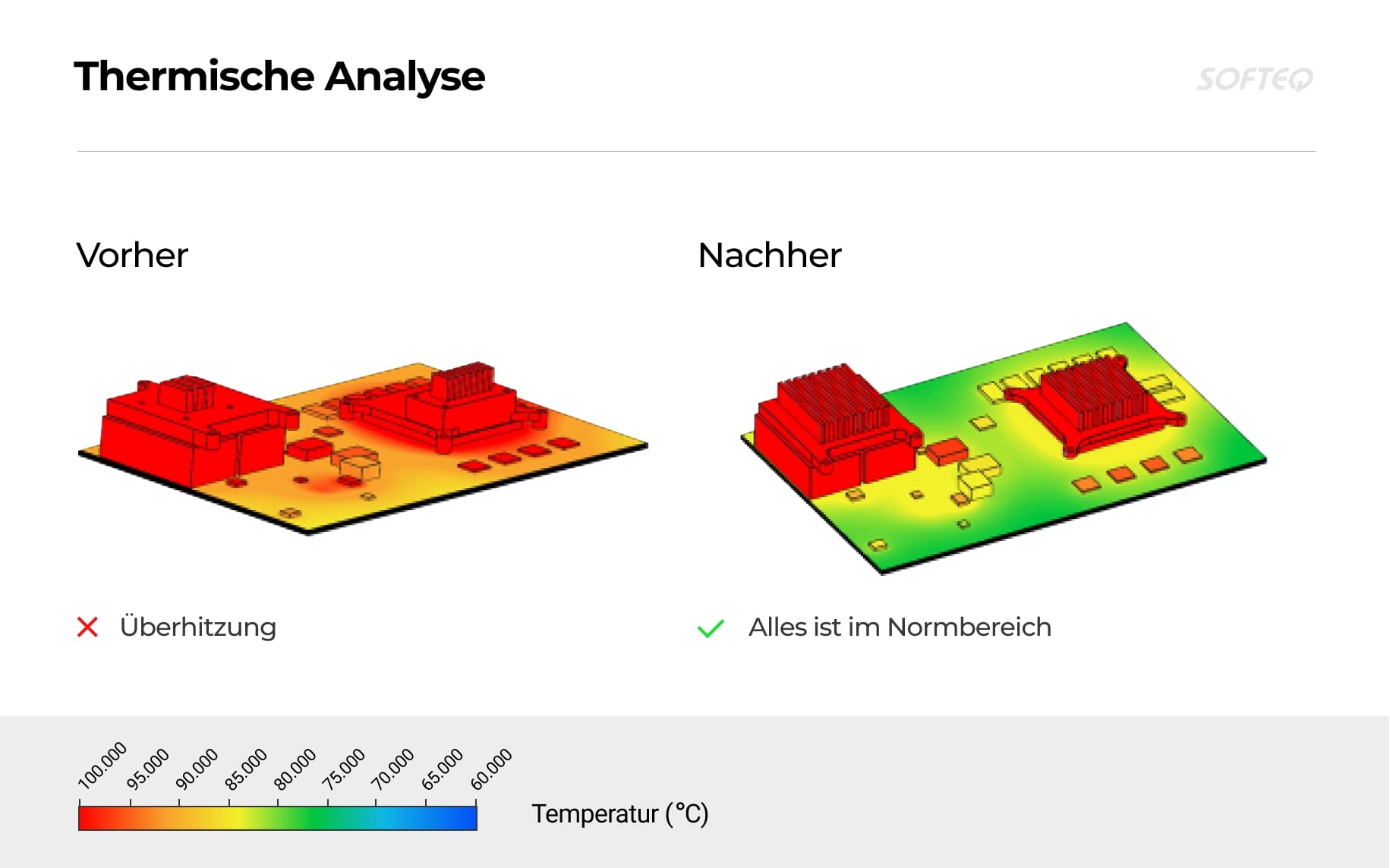 Chips auf der Platine arbeiten bei hohen Geschwindigkeiten mit großen Informationsmengen. Dies erfordert viel Energie, die dann als Wärme abgeführt wird. Eine Überhitzung des Chips reduziert die Geschwindigkeit und verursacht in einigen Fällen ein Abschalten des gesamten Systems. Durch eine thermische Analyse überprüfte das Team die Ausgangskonfiguration der Kühlradiatoren, die die Wärme an die Umgebung ableiten und die Temperatur des Chips reduzieren.