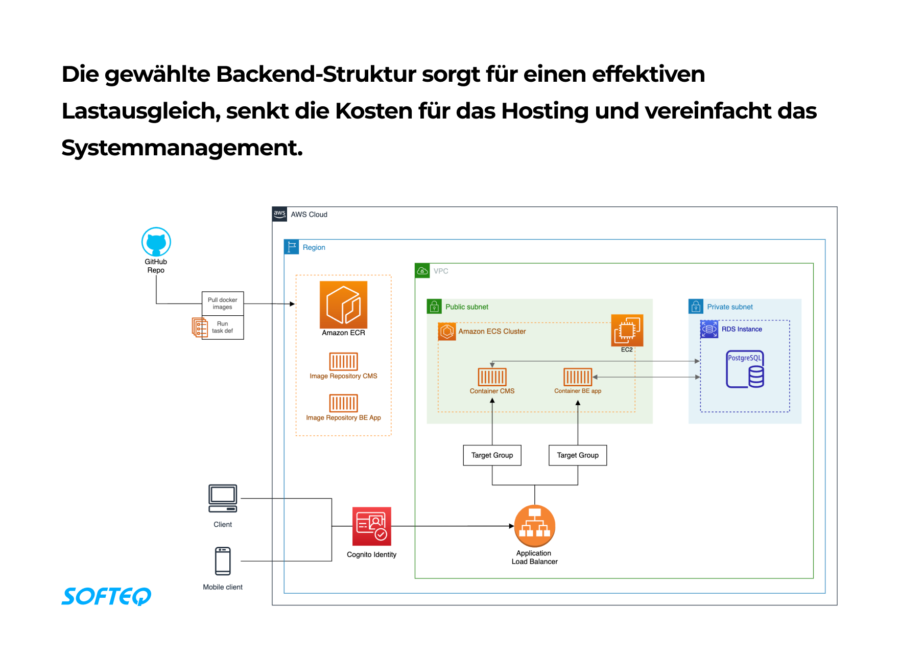 Wir hosten das Backend auf AWS-Diensten und nutzen hierfür den AWS Elastic Beanstalk. Dieser ermöglicht eine Skalierung der App, verteilt die Last und überwacht den Betriebszustand. Die Web-Benutzeroberfläche wird über AWS Amplify betrieben. Dies unterstützt die schnelle Entwicklung und Bereitstellung der Anwendung und erlaubt die Anpassung der Login- und Registrierungsseiten an kundenspezifische Anforderungen.