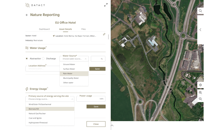 To get the report in a new dashboard, an app user adds their locations and the different types of water and energy resources used for production. Then, they get all insights presented in one dashboard. Within it, it’s possible to view the map of the target location from different angles and in various modes such as 3D and heat map. It’s also possible to filter the information by date to compare the environmental impact over time. The solution shows protected areas. For example, it spots vulnerable species that may be affected by the company’s activities.