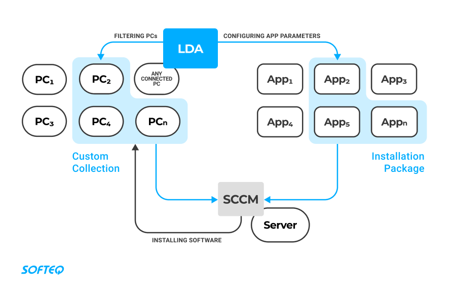 LDA allows admins to create Custom Collections—а group of computers filtered by any specific feature: PC model, Windows version, HDD capacity, etc. Thus, the SCCM deploys chosen apps only on the client devices belonging to the custom collection.