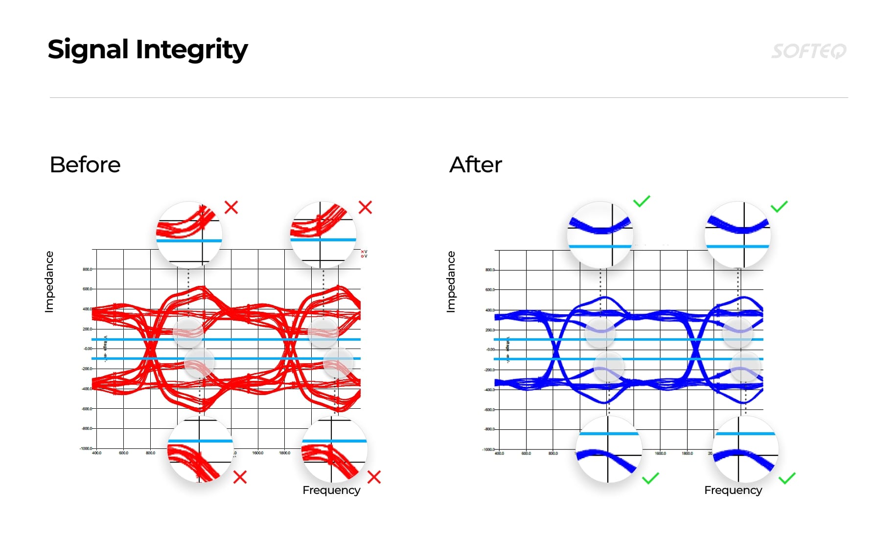 As the customer’s device supports high-speed interfaces (memory, Ethernet, ADCs), it’s sensitive to any delay in signal transmission between chips. Physical properties of the board materials—copper, dielectric, fiberglass—can affect the transmission speed and cause read errors. We conducted signal integrity (SI) analysis to ensure that fast signals will not be severely distorted while transmitting from driver to receiver and will match voltage thresholds and timing requirements.