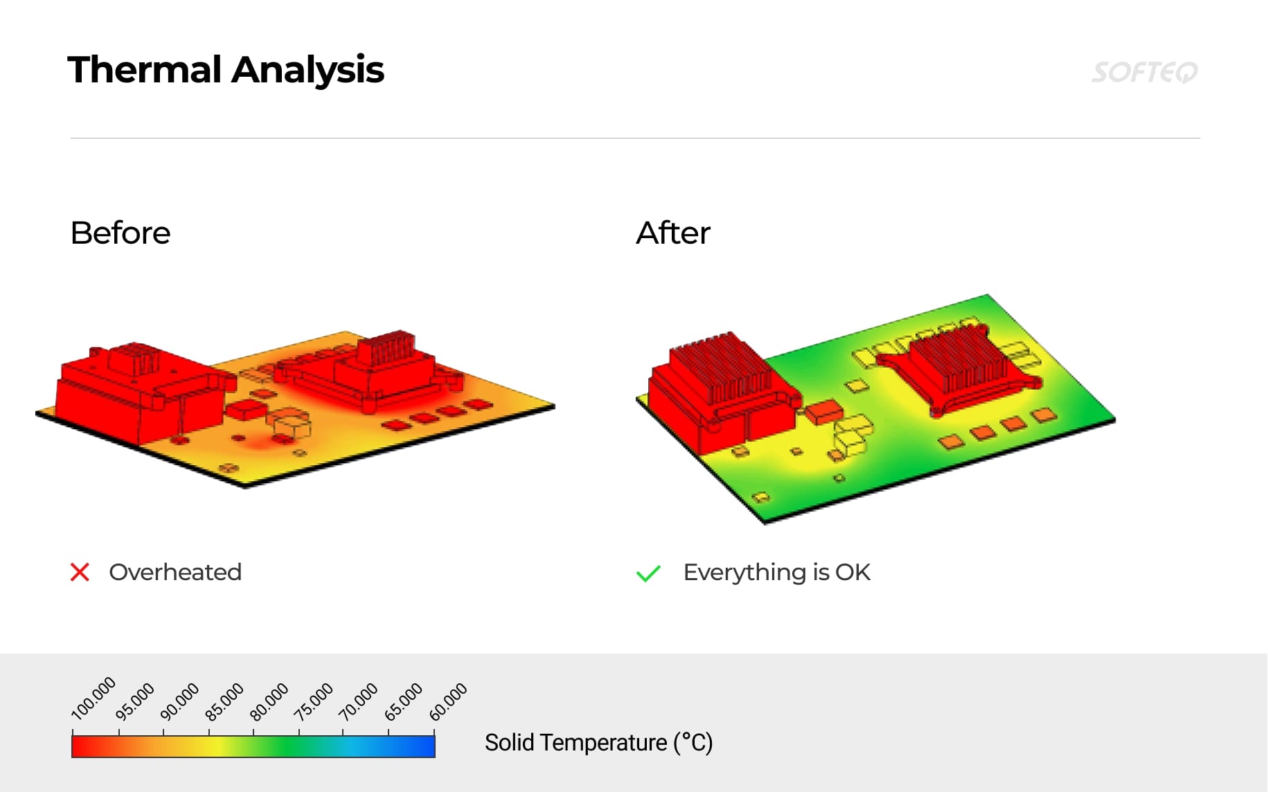Chips on the board operate at high speeds and with large volumes of information. This requires a large amount of energy, resulting in heat dissipation. Chip overheating reduces the speed of its operation and in some cases causes whole system shutdowns. The team conducted a thermal analysis to check the initial configuration of cooling radiators that dissipate heat into the environment and reduce the chip’s temperature.