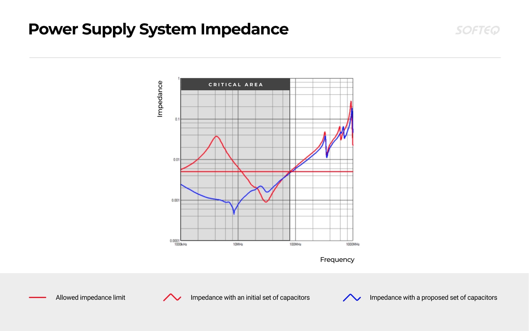In order to check if the capacitors were selected correctly in the original design (dimensions, capacity, number), we performed an AC decoupling simulation. The results showed that with the initial set of capacitors the power supply system significantly exceeded the permissible impedance limit. We proposed another set of capacitors with higher capacitance values, which significantly improved the impedance.